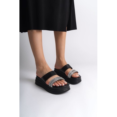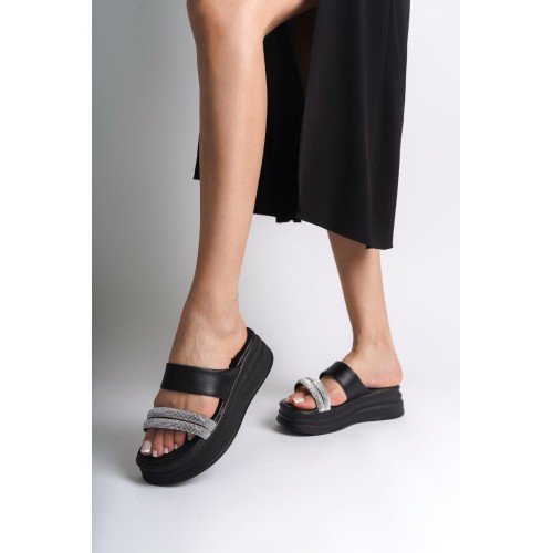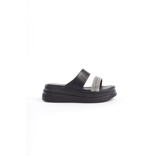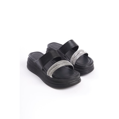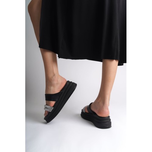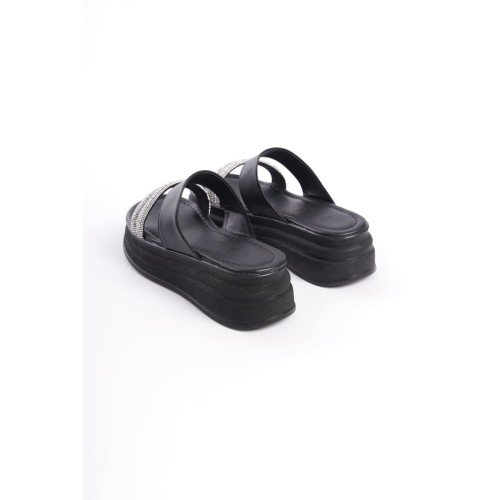 SARAH Düz Topuklu Taşlı Şeritli Kalın ve Ortopedik Taban Kadın Terlik CST - Siyah