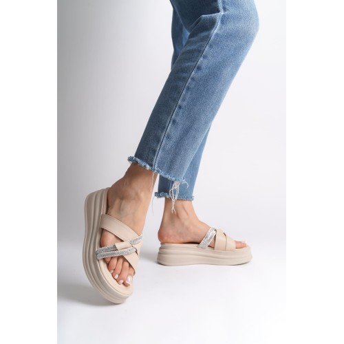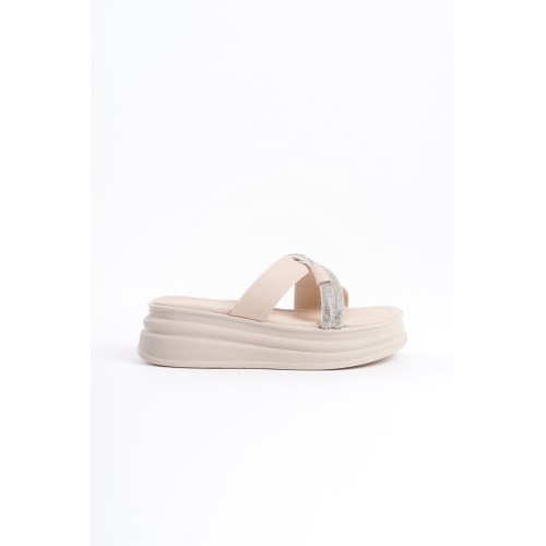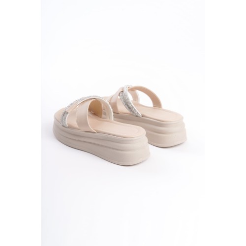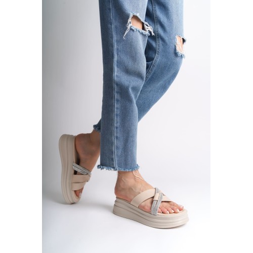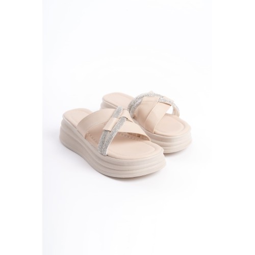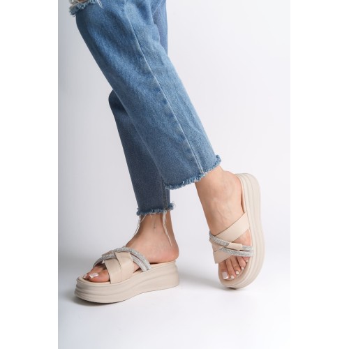 RUBY Düz Topuklu Taşlı Çapraz Şeritli Kalın ve Ortopedik Taban Kadın Terlik CKT - Krem
