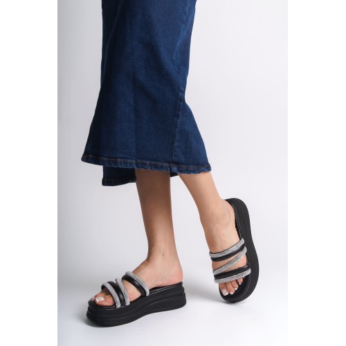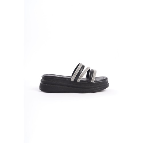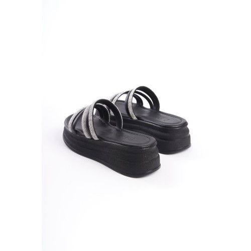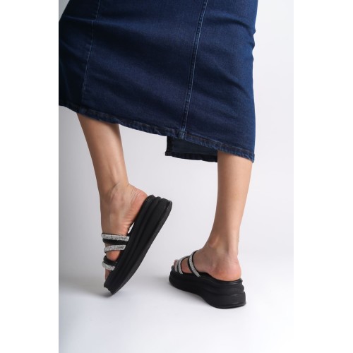 ELISE Düz Topuklu Şeritli Taşlı Kalın ve Ortopedik Taban Kadın Terlik CST - Siyah