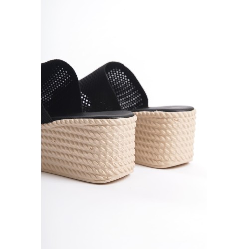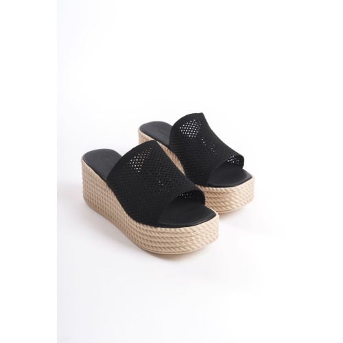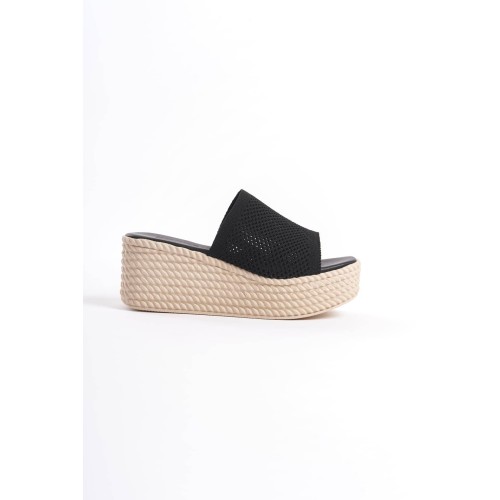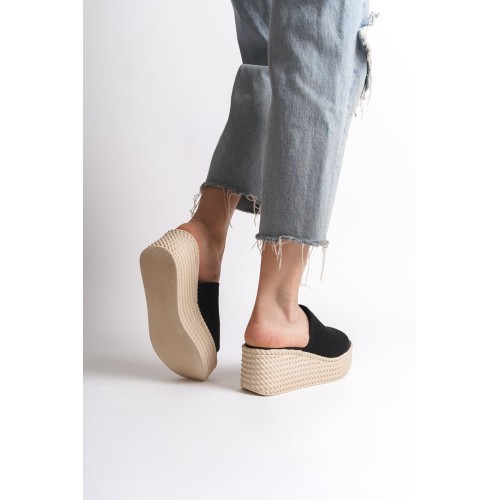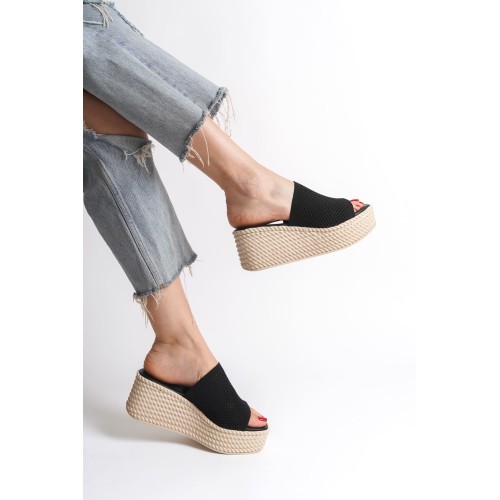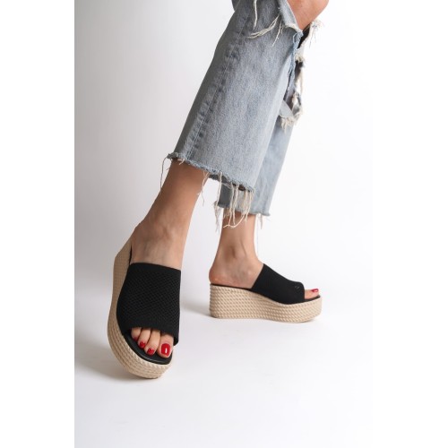 MARLA Dolgu Topuklu Ortopedik Taban Hasır Görünümlü Triko Kadın Terlik TKT - Siyah