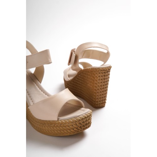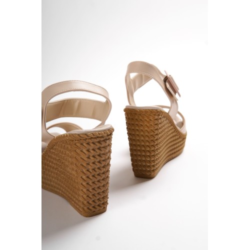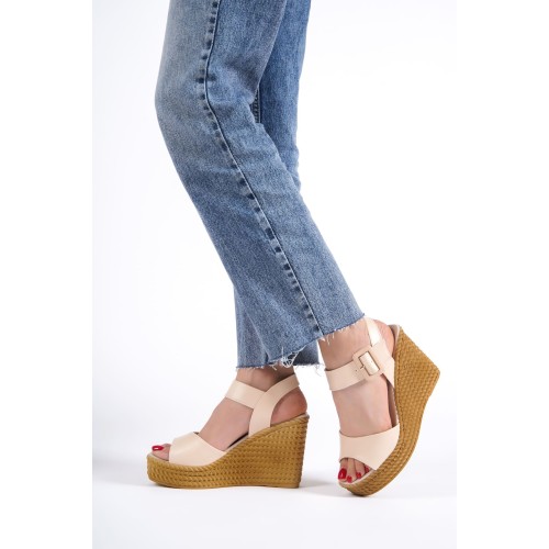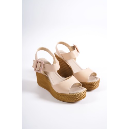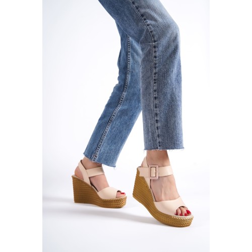 PERLA Tokalı Lastikli Dolgu Topuklu Ortopedik Taban Hasır Görünümlü Kadın Sandalet CKT - Ten