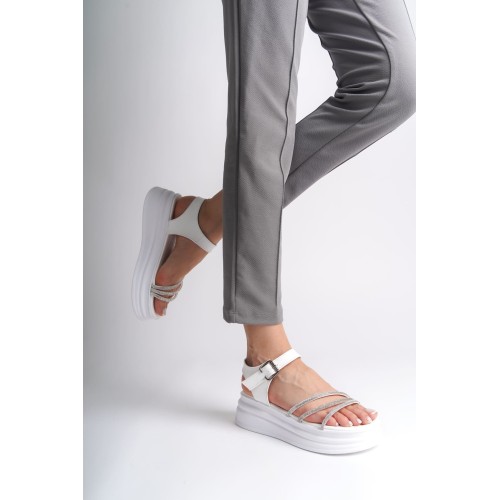 EVA Kalın Tokalı Taşlı Şeritli Ortopedik Taban Kadın Sandalet CBT - Beyaz