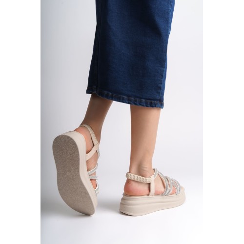 ELENA Lastikli Taşlı Şeritli Ortopedik Taban Kadın Sandalet CKT - Krem