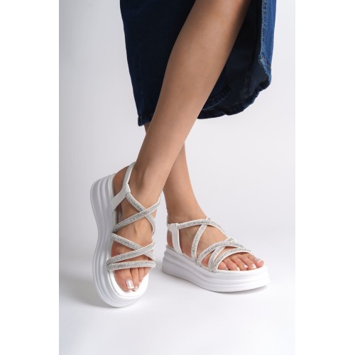 ELENA Lastikli Taşlı Şeritli Ortopedik Taban Kadın Sandalet CBT - Beyaz
