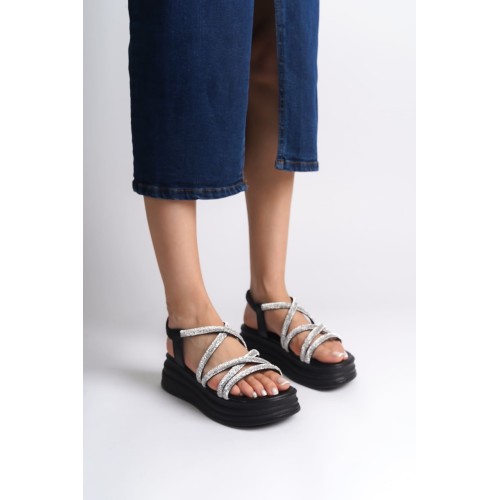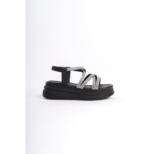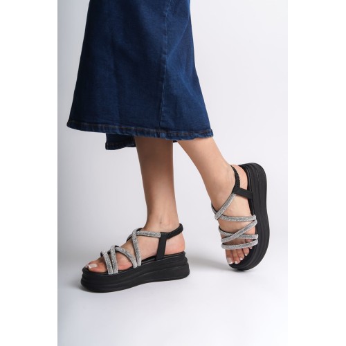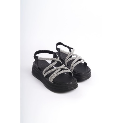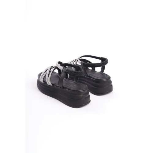 ELENA Lastikli Taşlı Şeritli Ortopedik Taban Kadın Sandalet CST - Siyah