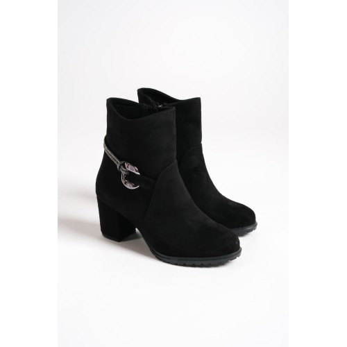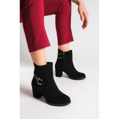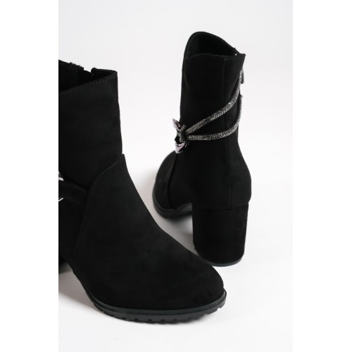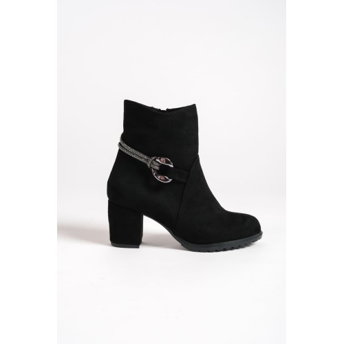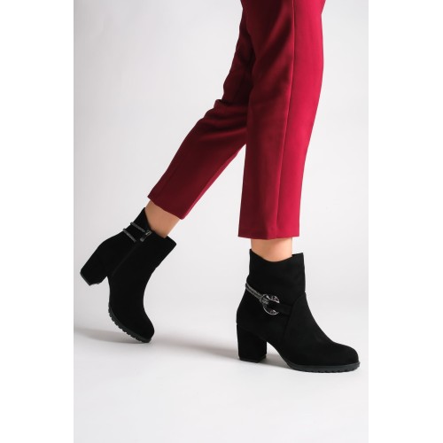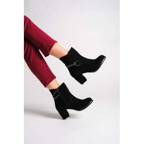EDNA Fermuarlı Ortopedik Taban Taşlı Topuklu Süet Kadın Bot SST - Siyah