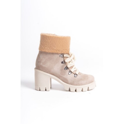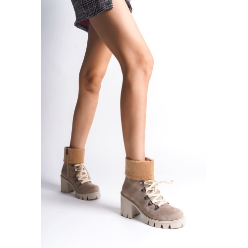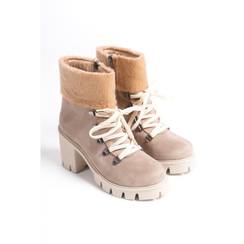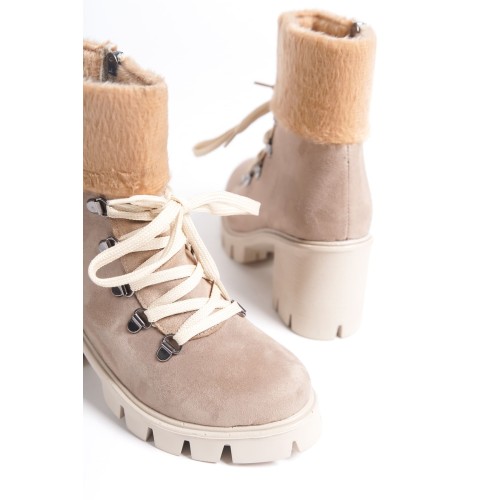 EMMA Bağcıklı Fermuarlı Ortopedik Taban Topuklu Kürk Detaylı Süet Kadın Bot STT - Ten