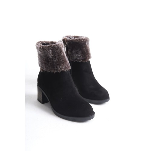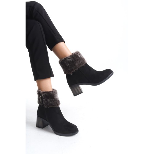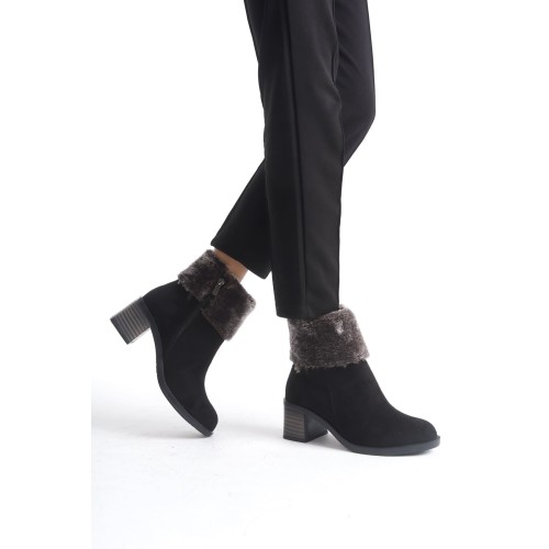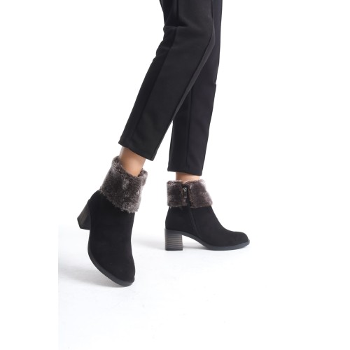 KATYA Fermuarlı Ortopedik Taban Topuklu Kürk Detaylı Süet Kadın Bot SST - Siyah