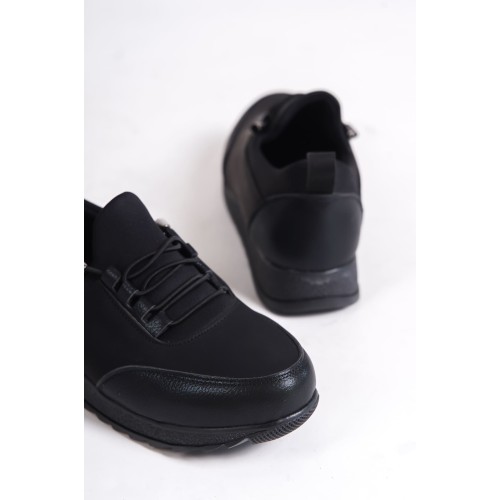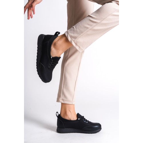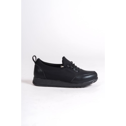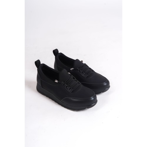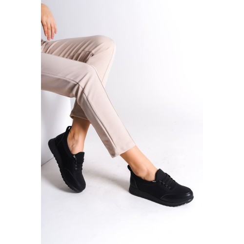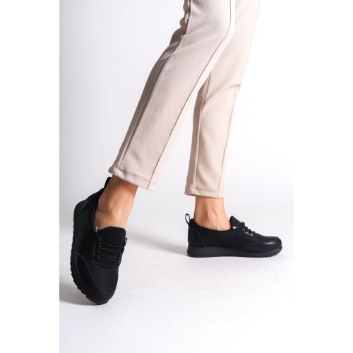 VIOLET Bağcıklı Lastikli Ortopedik Rahat Taban Cilt Detaylı Klasik Kadın Babet Anne Ayakkabısı CST - Siyah