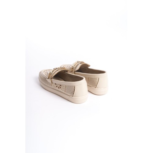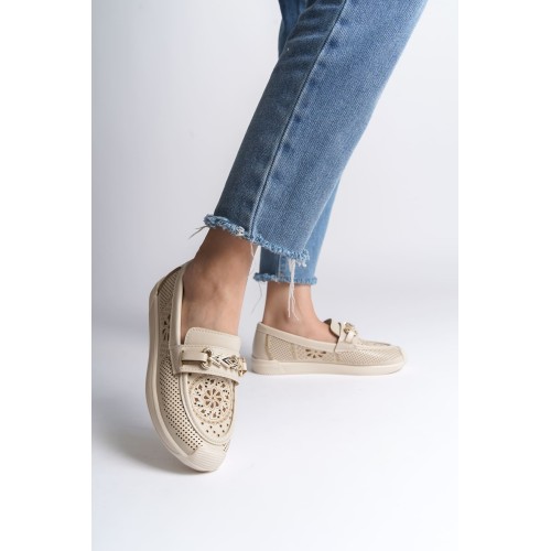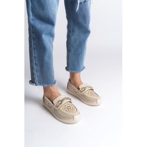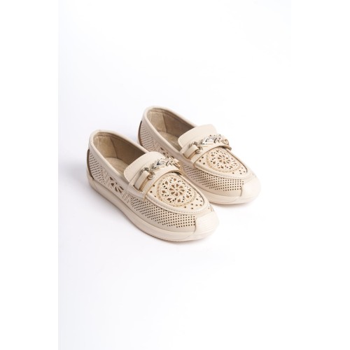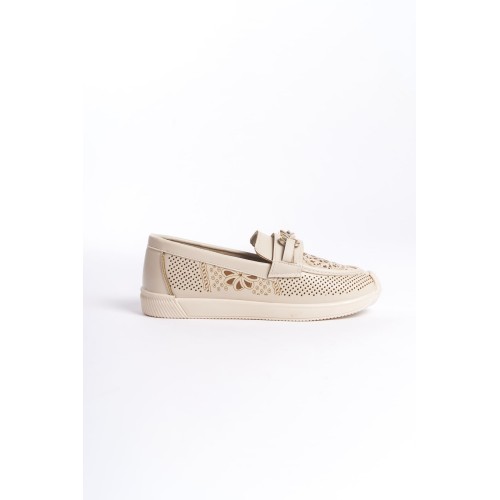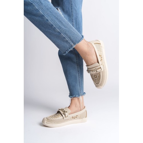 LILY Bağcıksız Ortopedik Rahat Taban Çiçek Desenli Kadın Babet Ayakkabı CKT - Krem