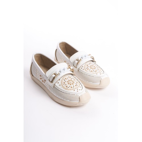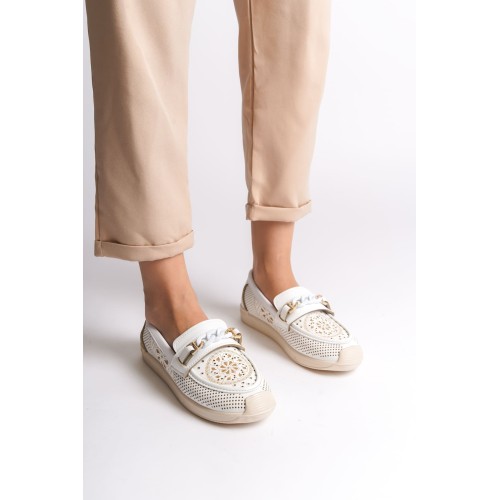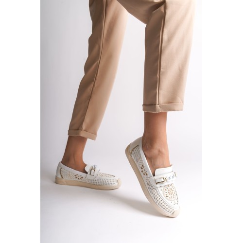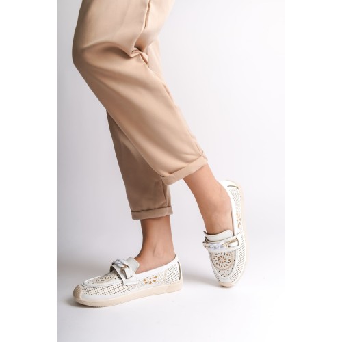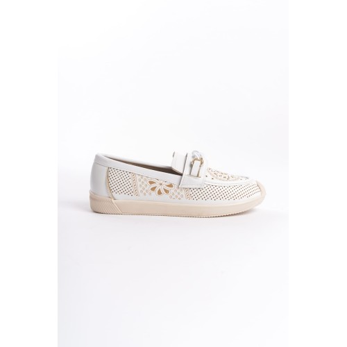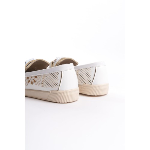 LIZY Bağcıksız Ortopedik Rahat Taban Çiçek Desenli Kadın Babet Ayakkabı CKT - Beyaz