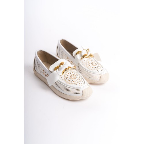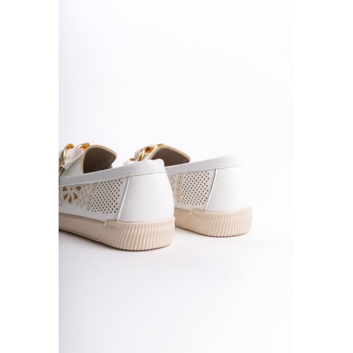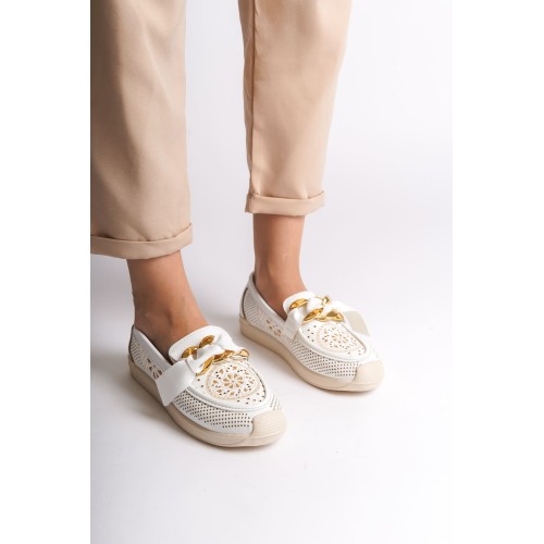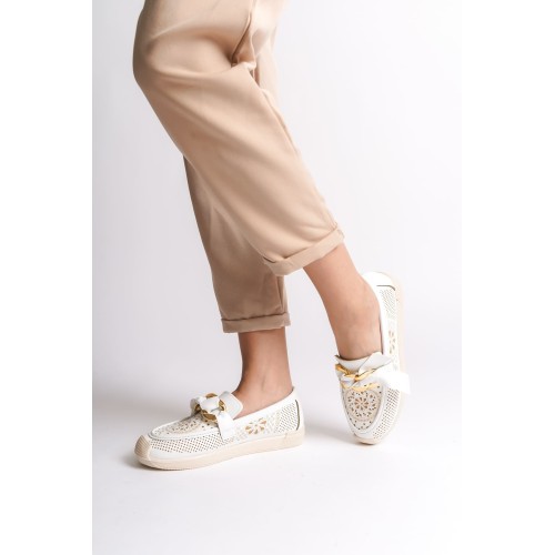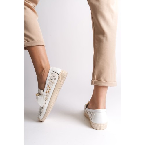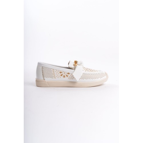 LYDIA Bağcıksız Ortopedik Rahat Taban Çiçek Desenli Kadın Babet Ayakkabı CKT - Beyaz